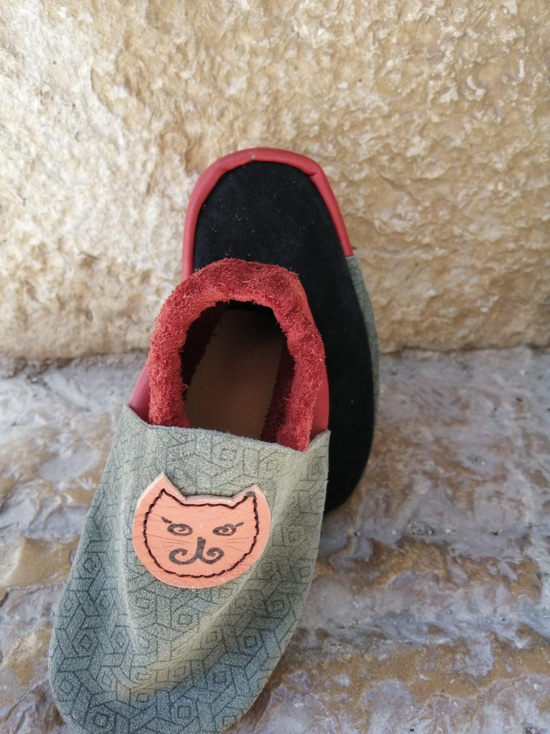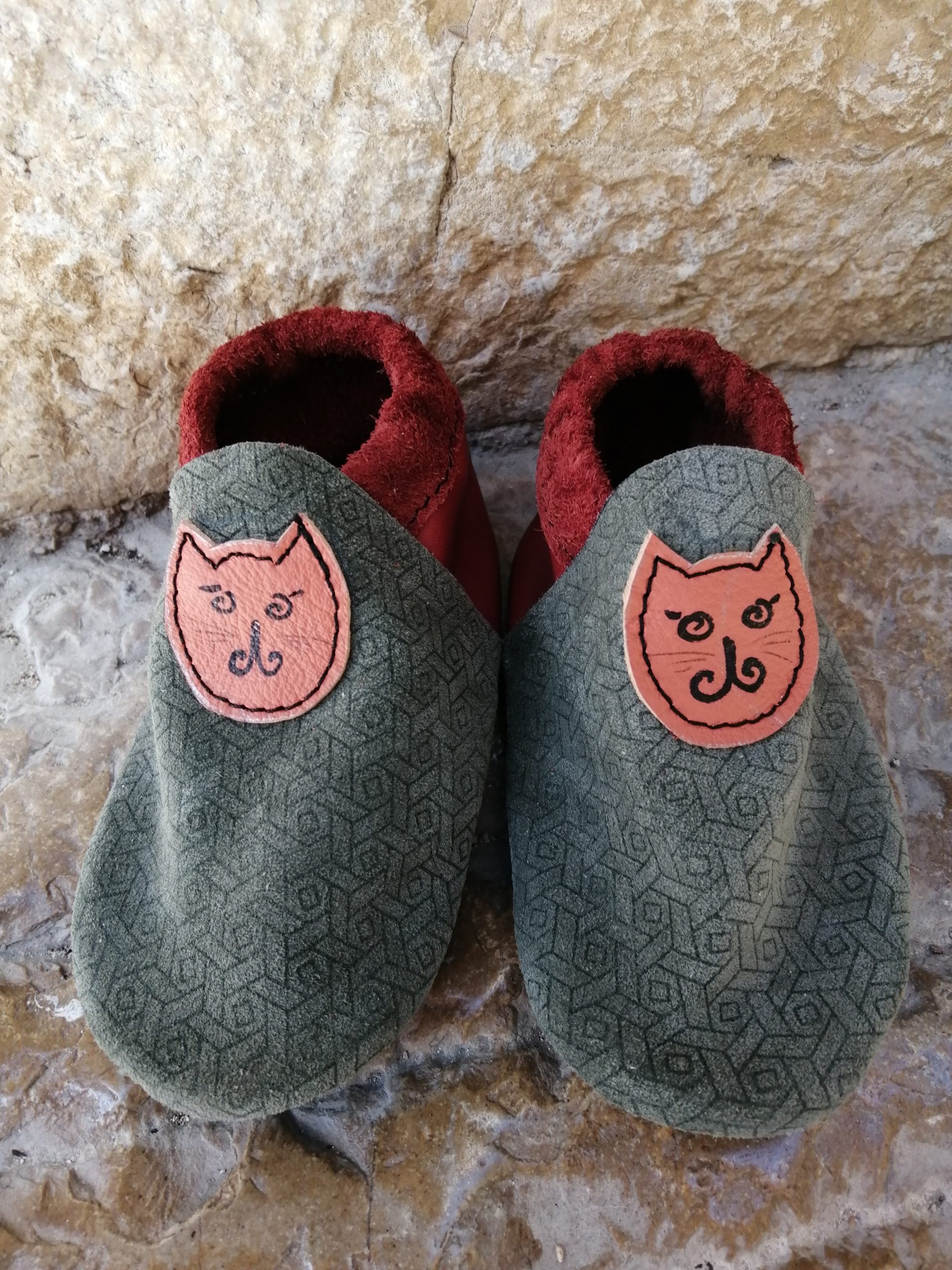Chaussons bébé en cuir vachette, souple et doux . Couleur kaki fantaisie et orange. Taille 1 qui correspond au 19/20.